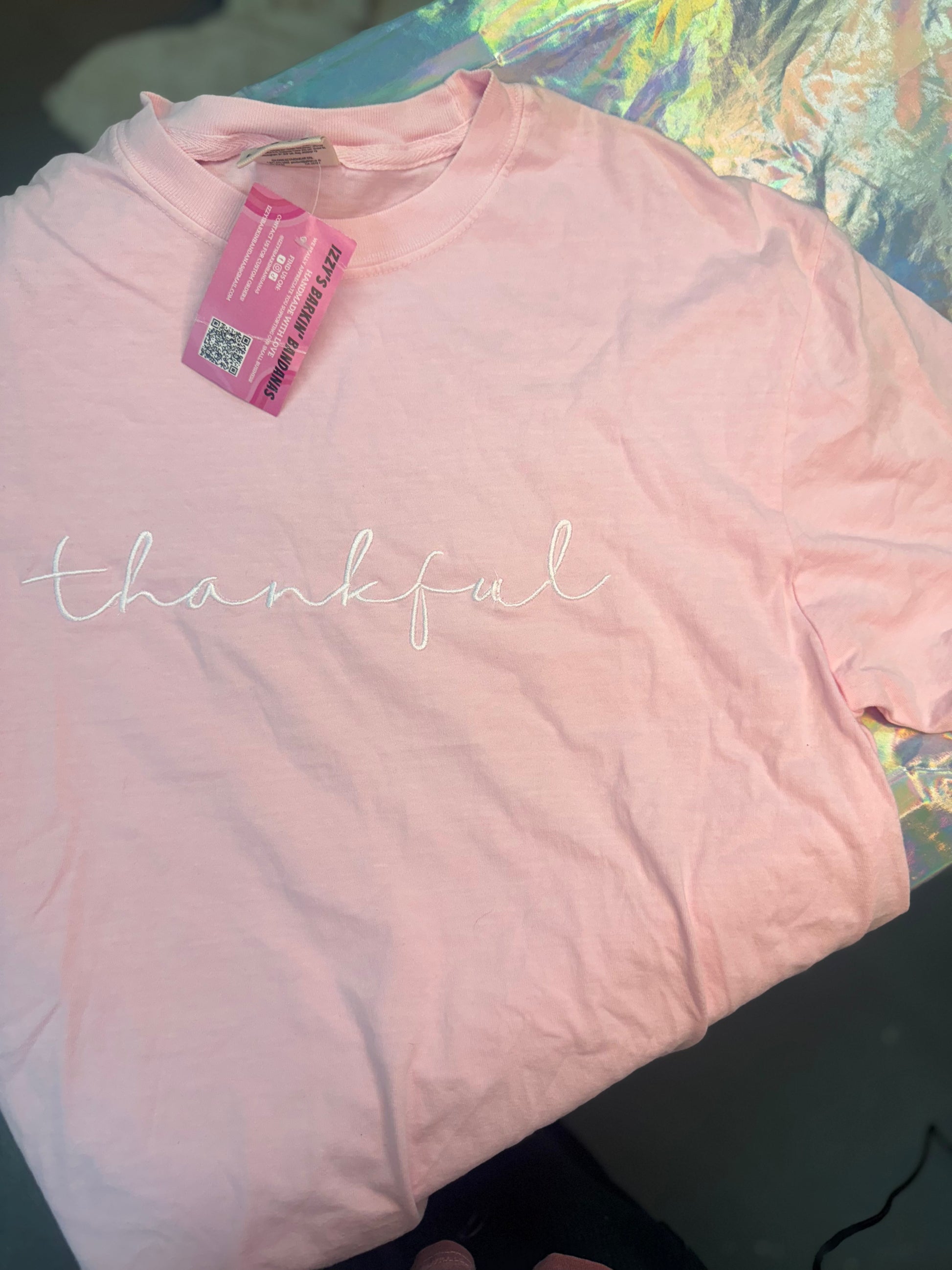 Features: unisex size large, light pink comfort colors tee, imperfect stitching