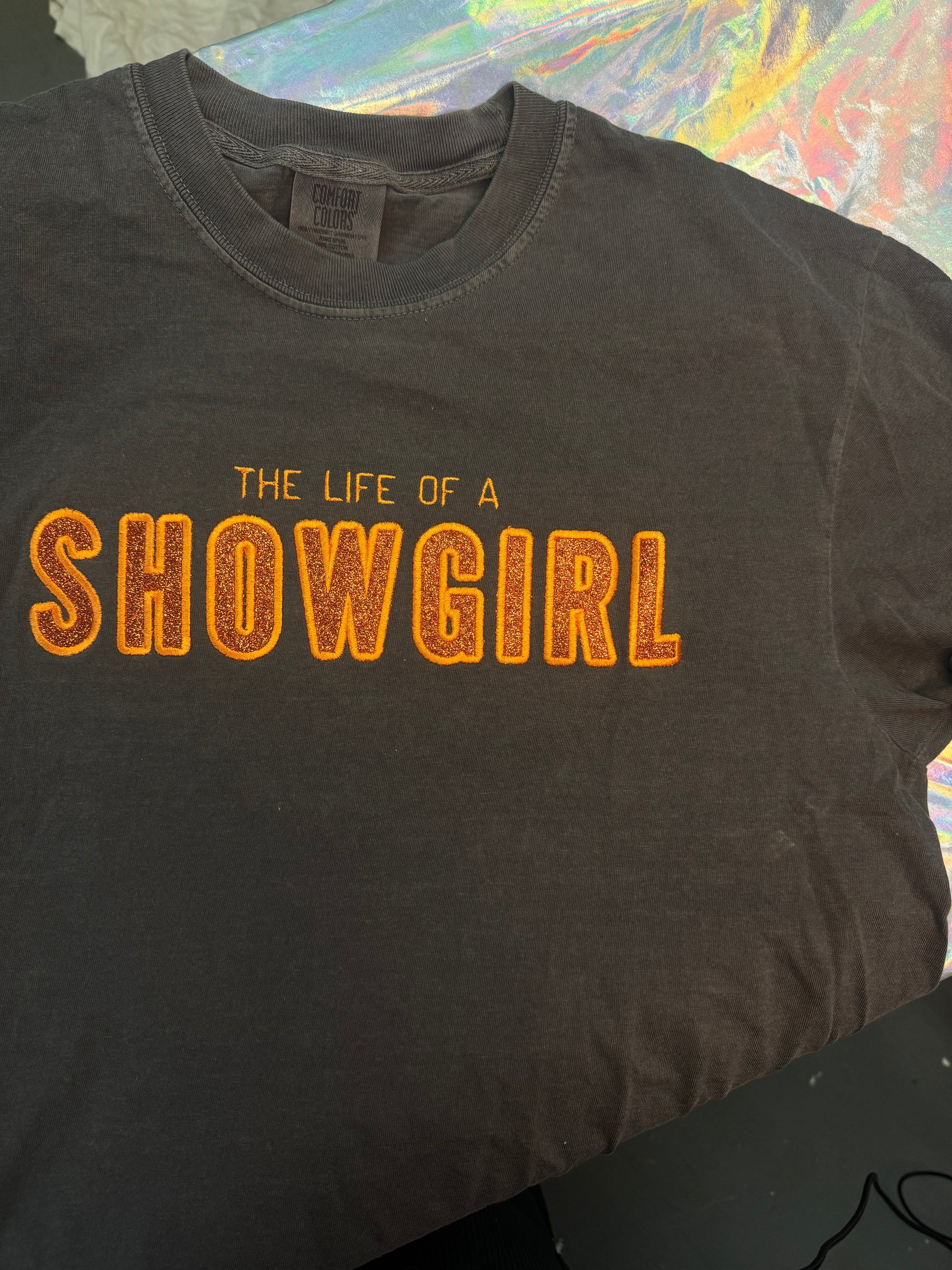Features: unisex size large, comfort colors pepper tee, glitter embroidered