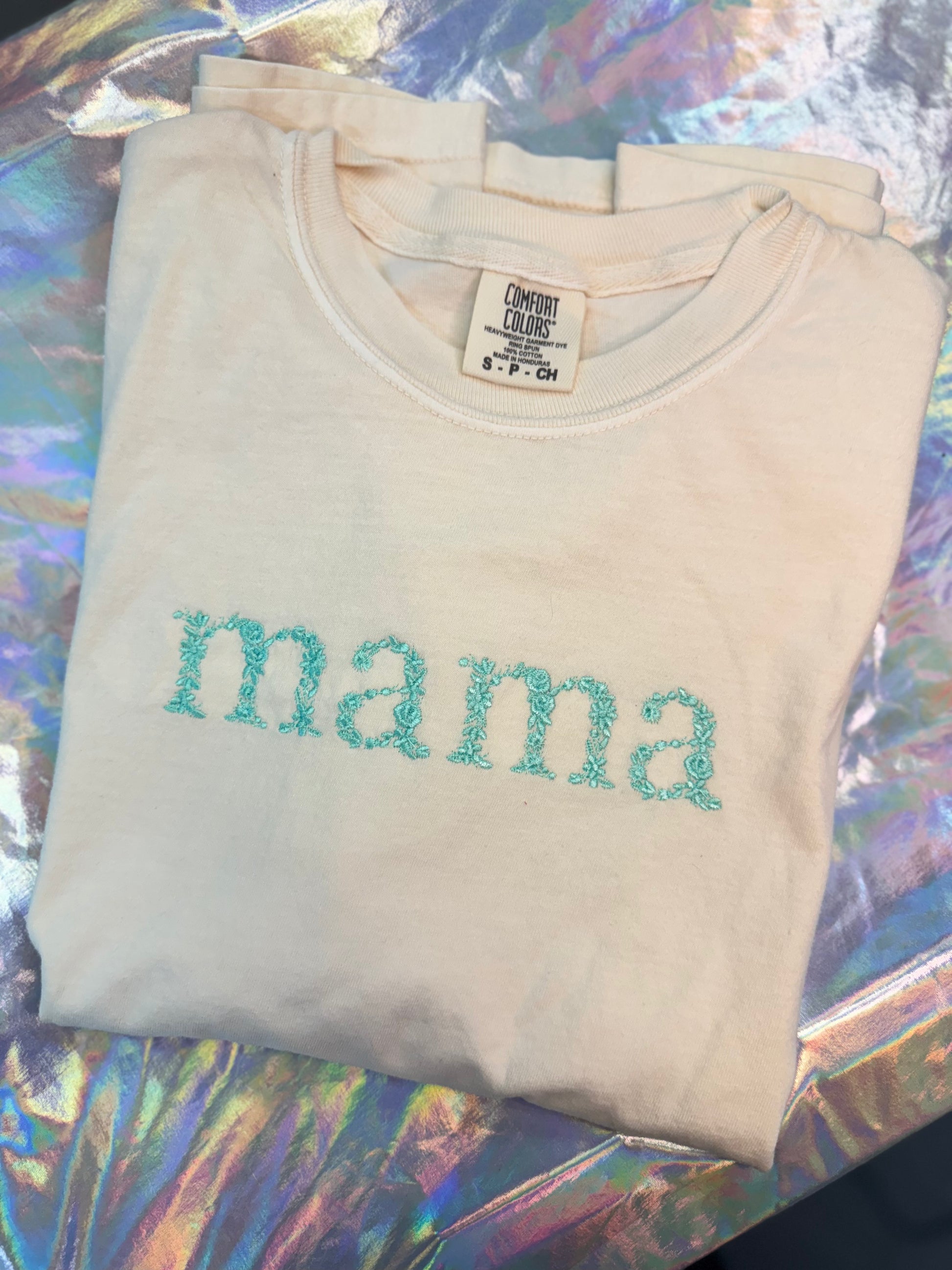 Features: unisex size small, ivory comfort colors tee, embroidered, mint thread