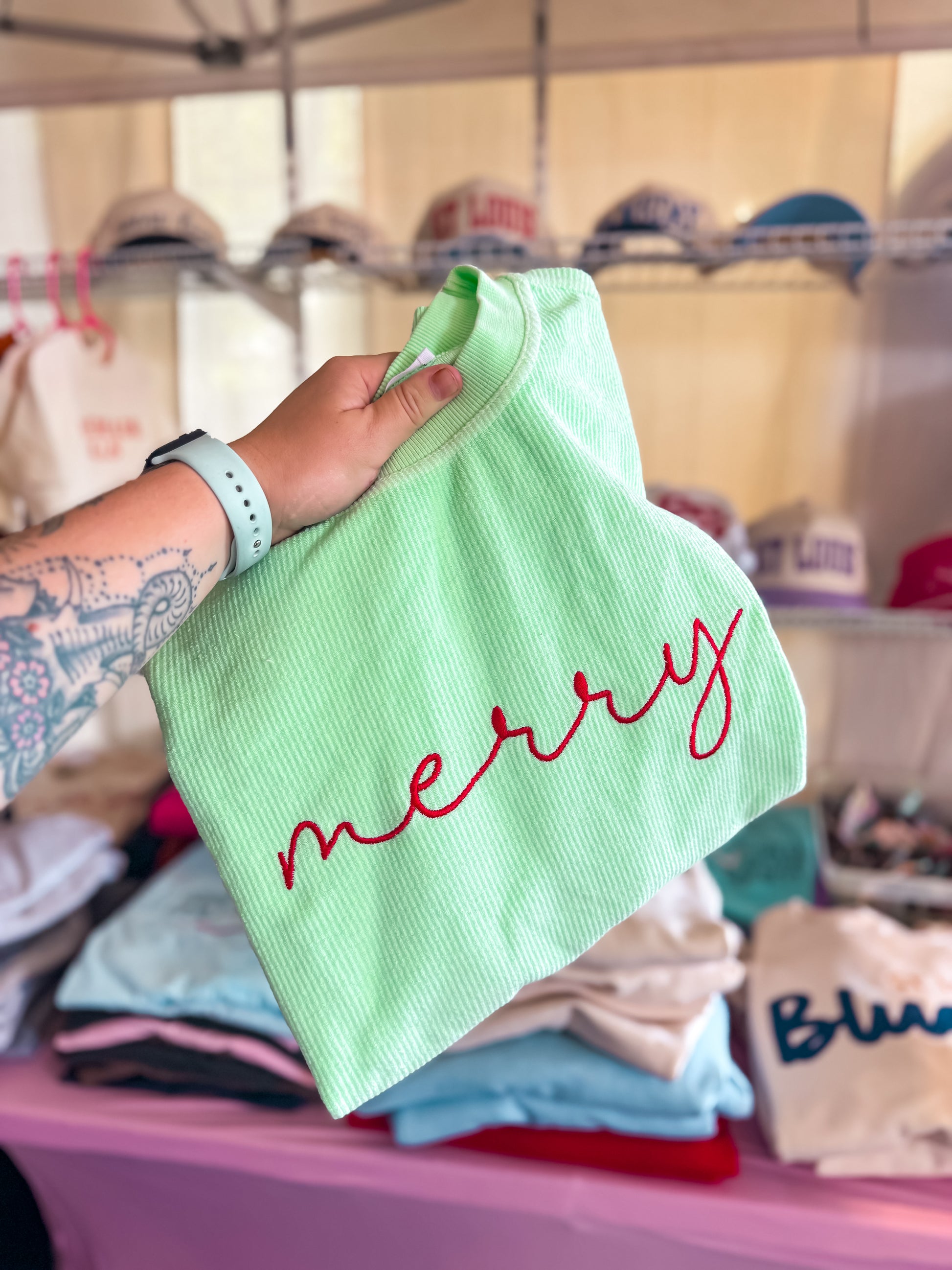 Washed out garment dyed green corded crewneck embroidered with red thread. Color may reflect differently per screen.