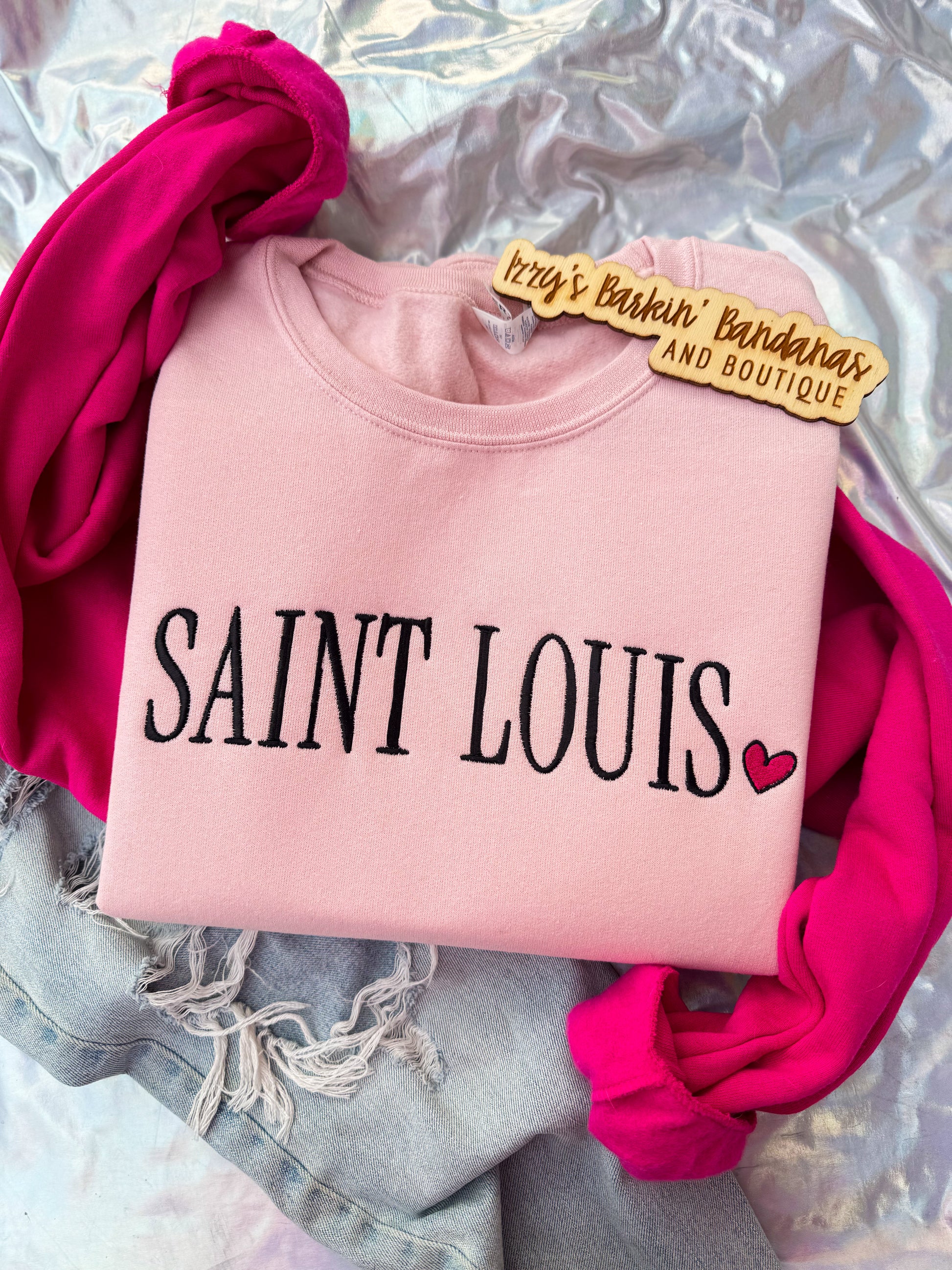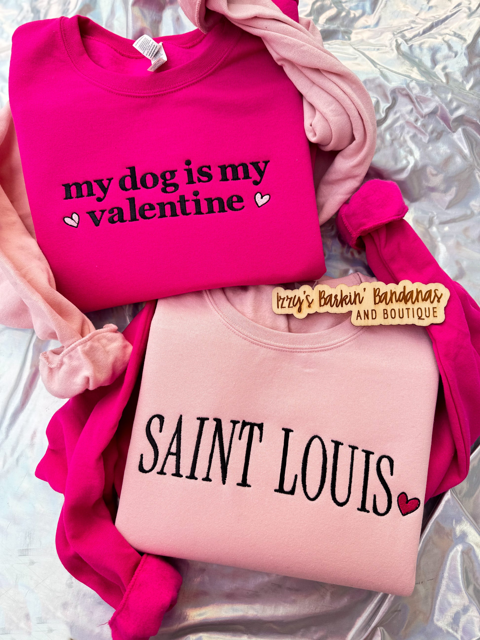 The samples shown feature “my dog is my valentine” and “Saint Louis”, but these are fully customizable — if you have a different word, phrase, city, name, or idea in mind, just send us a message! I can embroider anything you’d like to make it uniquely yours.