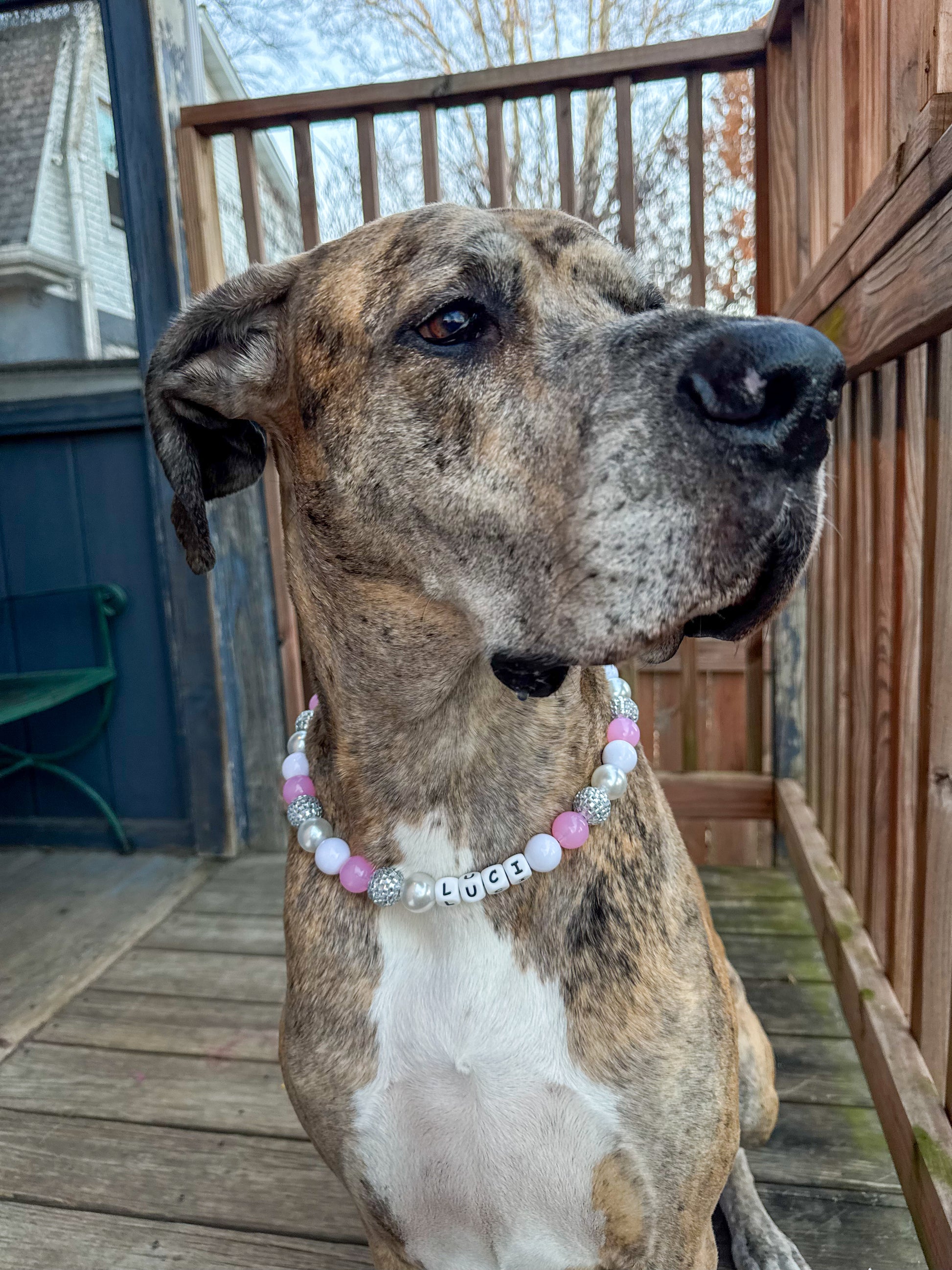 Add a little glam to your pup’s everyday look with this stunning beaded dog collar, designed to make dogs of all sizes shine. Featuring a mix of metallic, rhinestone and pearl beads, this collar brings the perfect balance of elegance and fun—ideal for special occasions, photos, or just because your pup deserves to sparkle.