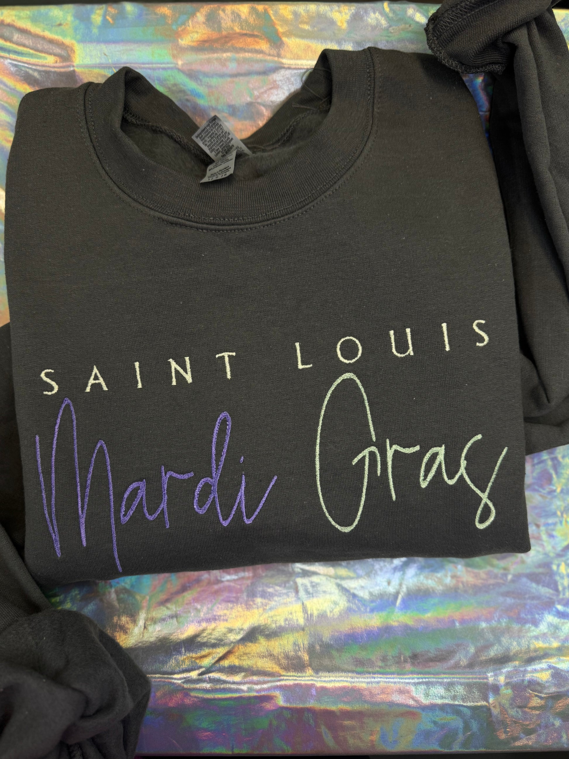 Features: Unisex size large, dark grey crewneck, pastel thread colors