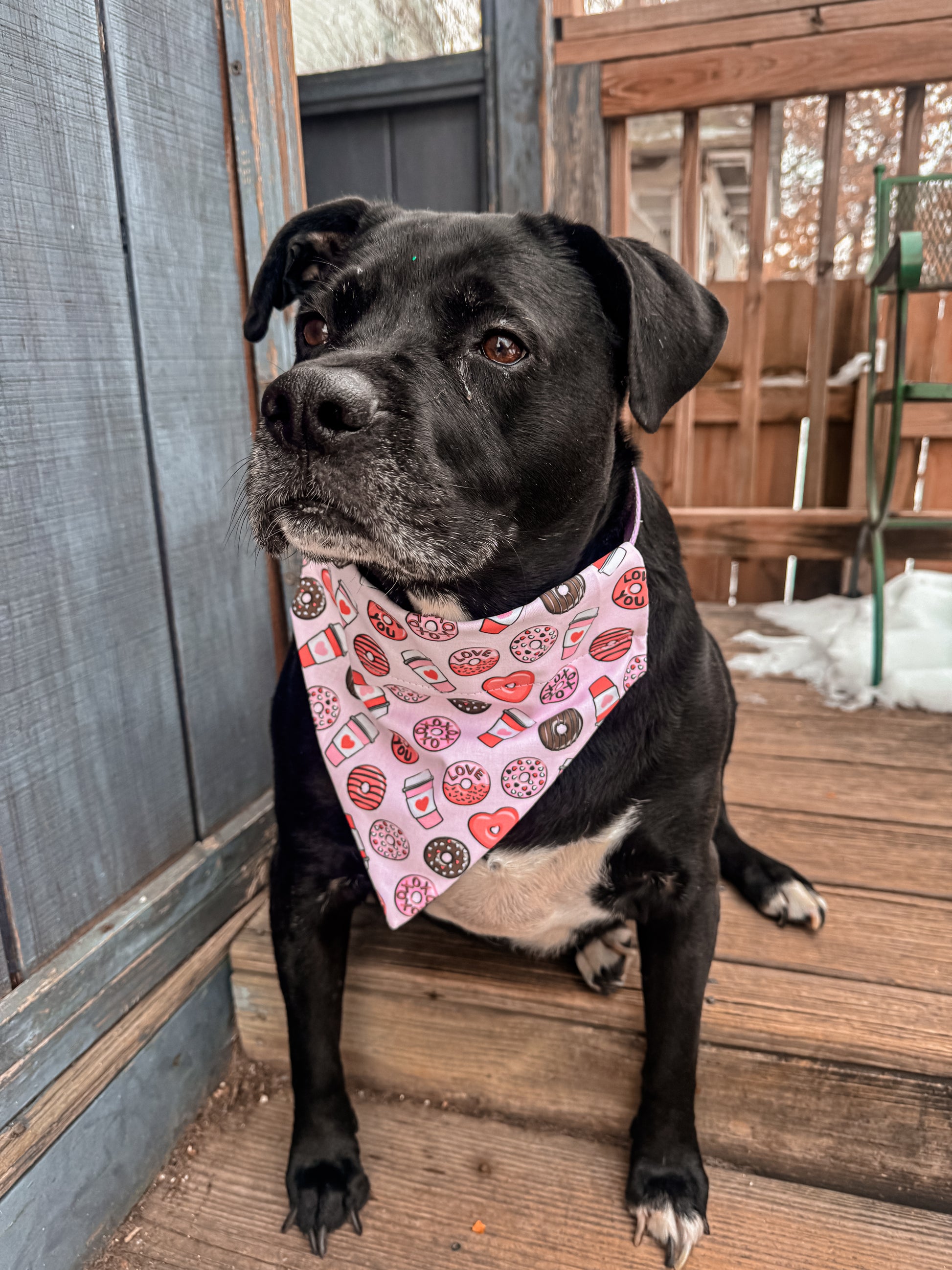 Dress your furry best friend in this Valentines Donuts and Coffee Over-the-Collar Bandana! Designed to slide right onto your pet’s existing collar, these bandanas stay secure, sit comfortably, and look absolutely adorable—whether your pet is posing for photos or prancing around the house.